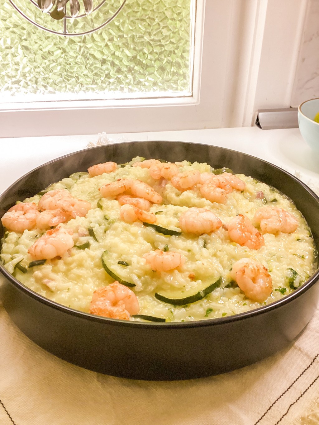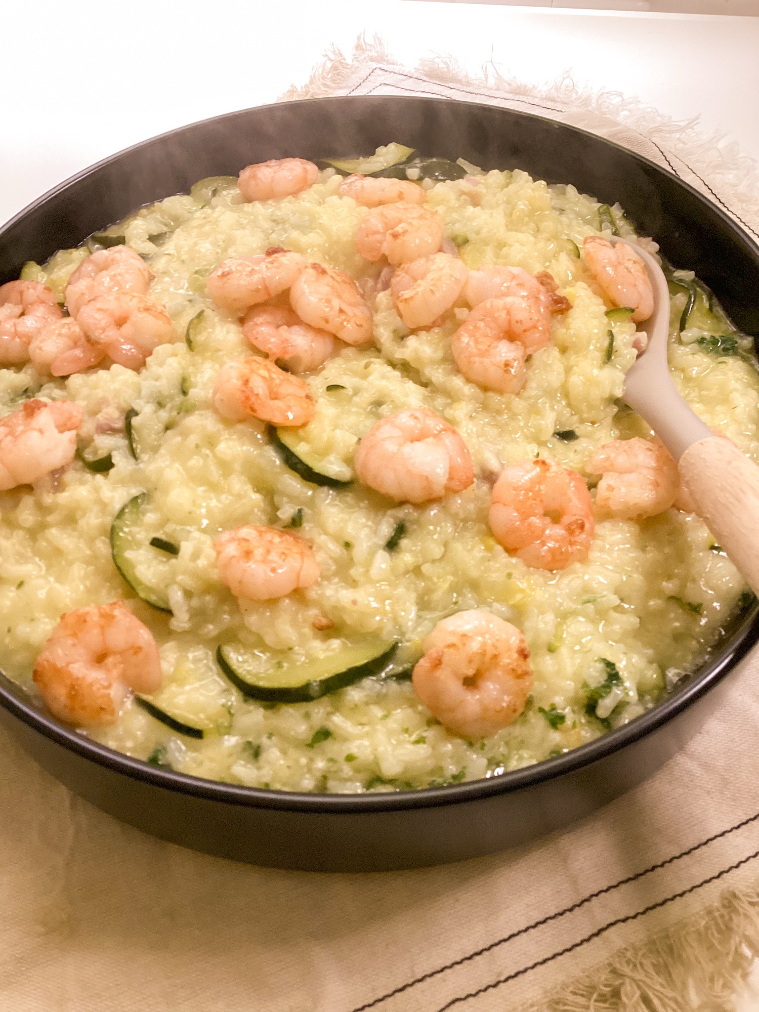 Mit den Garnelen obenauf servieren.