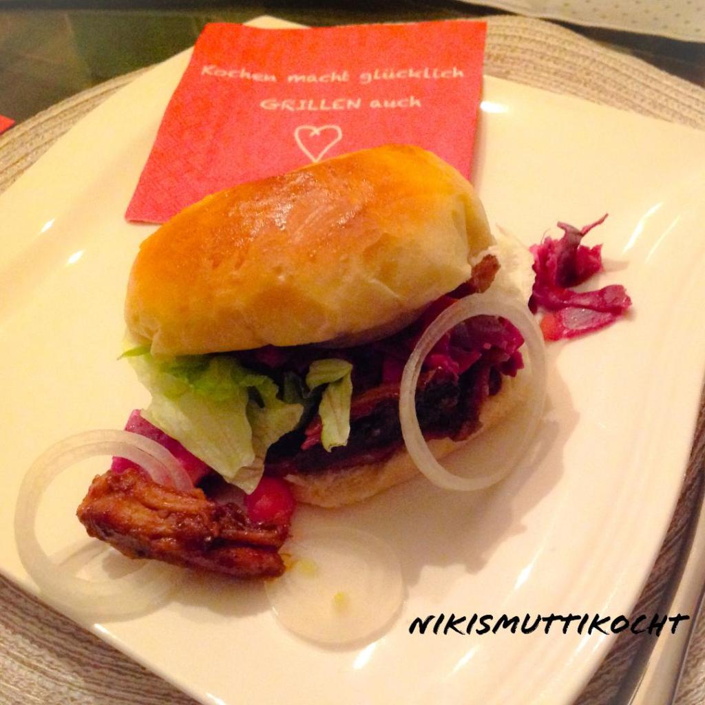 Währenddessen die Saftmischung aus dem Bräter auskratzen und in einen kleinen Topf umfüllen. Kurz vor Ende der Ruhephase mit etwas Barbecuesauce, , vermischen und kurz aufkochen lassen. Das Pulled Pork mit 2 Gabeln auseinander zupfen und mit der Soße vermischen. Die Brötchenhälften mit dem Pulled Pork belegen. Evtl. noch etwas Barbecuesauce draufgeben.