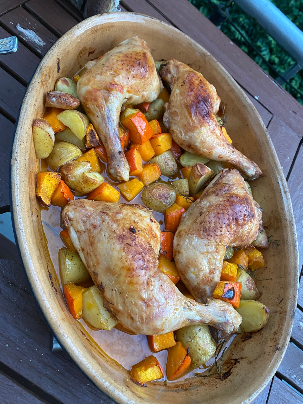 Auf die Gemüsewürfel legen und nochmals 30 Min. braten. Schenkel wenden und ca. 30 Min. fertig garen.