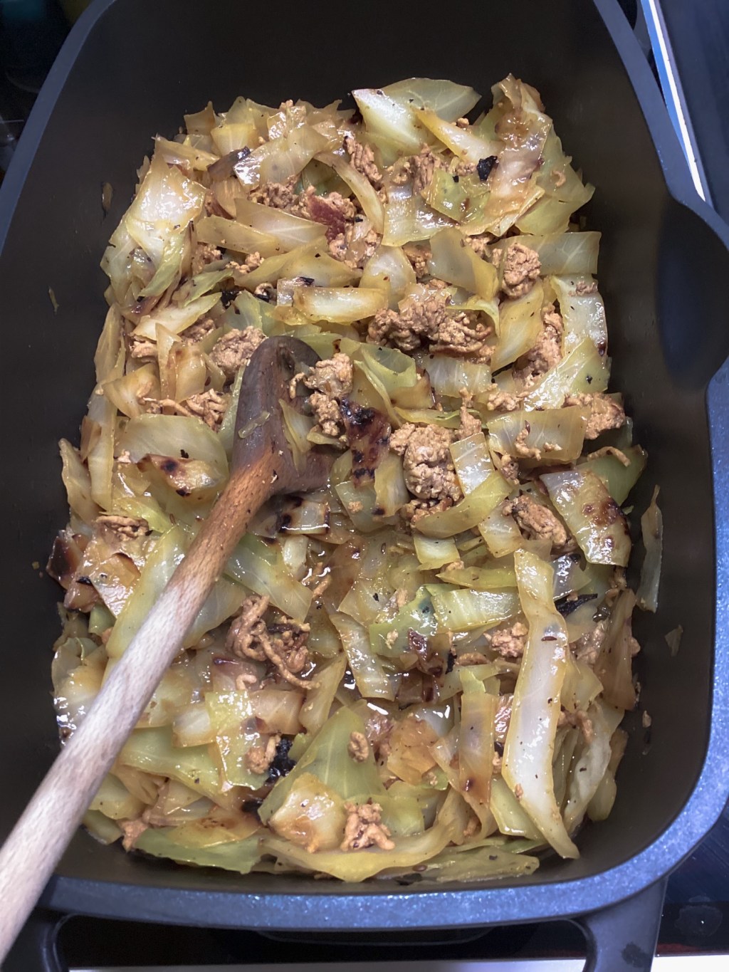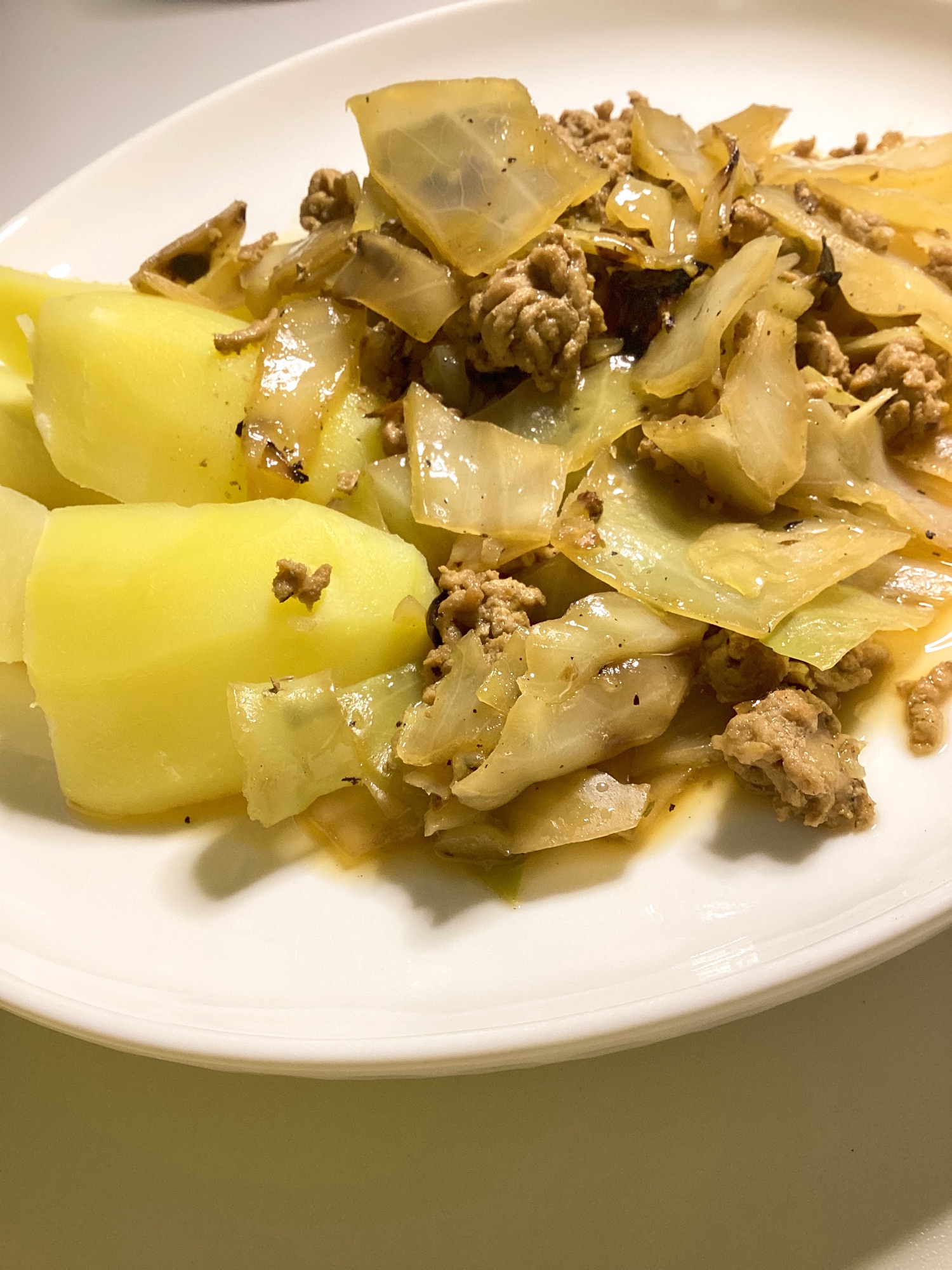 In einer separaten Pfanne das Hack anbraten, mit Salz und Pfeffer würzen. Zugeben und soviel Brühe zugeben, dass der Kohl bedeckt ist. Gut würzen und zugedeckt ca. 30 Minuten durchgaren.