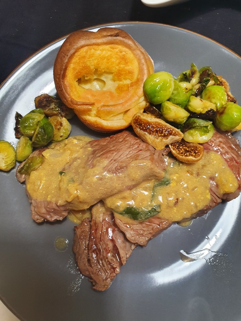 Wenn Euch noch ein Rezept für das Fest der Feste fehlt, wo Ihr mit wenig Aufwand so richtig Eindruck schinden könnt – , dann müsst Ihr dieses wählen. Denn was sich hier in geschmackvoller Harmonie auf dem Teller abspielt, hat einfach alles, was das Herz begehrt: saftiges Entrecôte, fluffige Yorkshirepuddings aus dem Ofen, aromatischerRosenkohl mit feinen Feigenstückchen und eine cremige Zwiebelsauce mit Senf und Salbei.