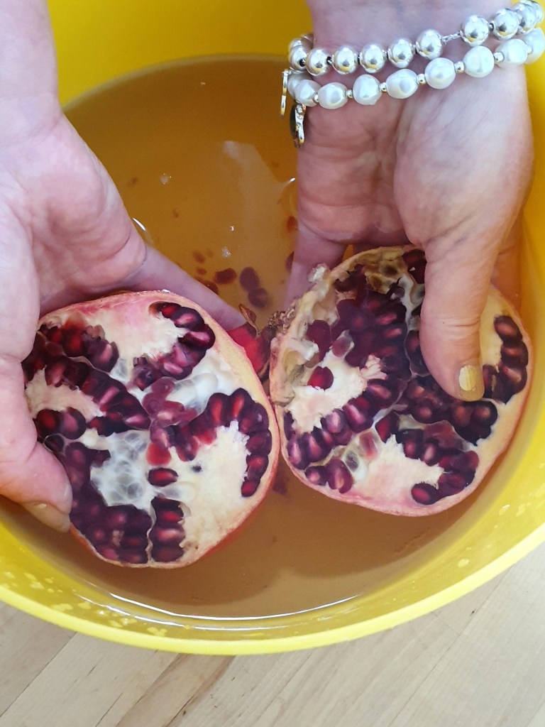 halbiert diese und legt sie in eine Schüssel mit kaltem Wasser, nun könnt Ihr die Kerne leicht aus der Schale lösen ohne das Eure Küche wie nach einem Massaker aussieht.