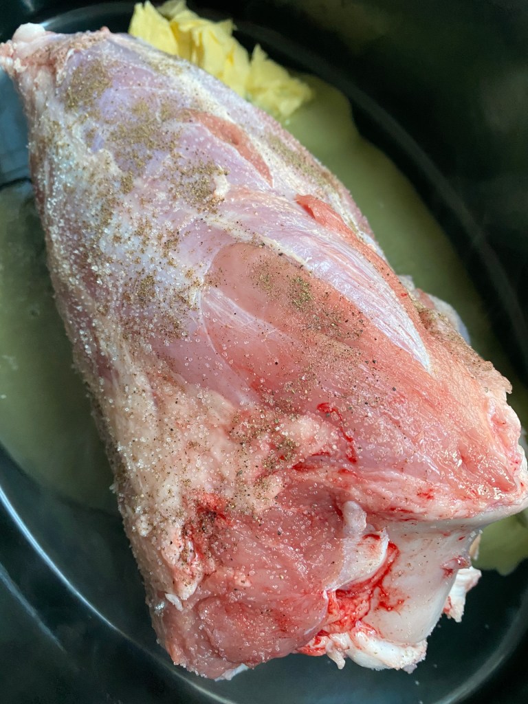 Mit Brühe und Wein auffüllen und 2 Stunden in den Ofen. Haxe immer mal wenden und mit Sud begießen.