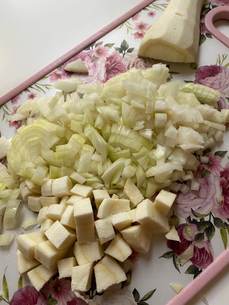 Zwiebeln würfeln und mit der geschälten und gewürfelten Petersilienwurzel zugeben und kurz mit anbraten.