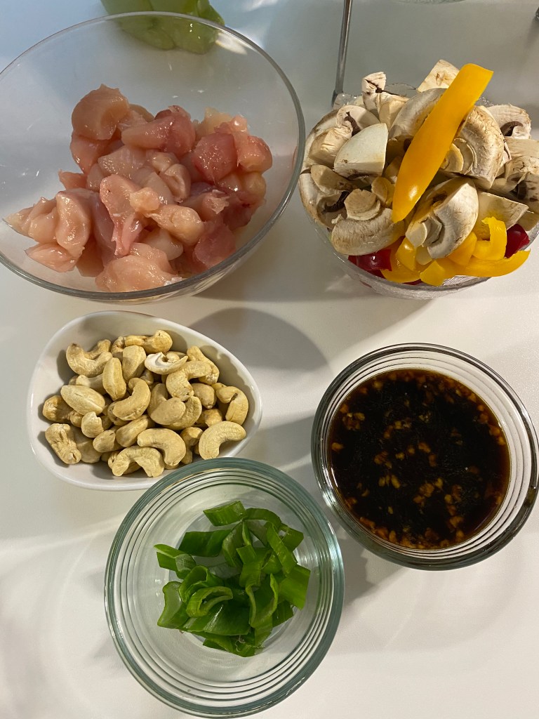 Die Zutatenliste ist kurz und bündig. Paprika, Zwiebeln, Champignons und Frühlingszwiebeln in Streifen oder Viertel schneiden. Hühnerbrust würfeln, salzen und mit etwas Mehl bestäuben. Bereitet alles vor, bevor ihr beginnt. Das Gericht wird schnell gehen!!