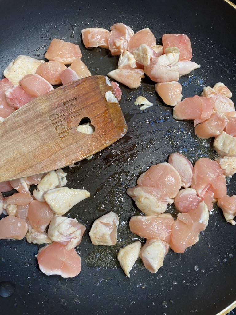 - Huhn hinzufügen. Lasst das Huhn 2 Minuten ohne Rühren braten .