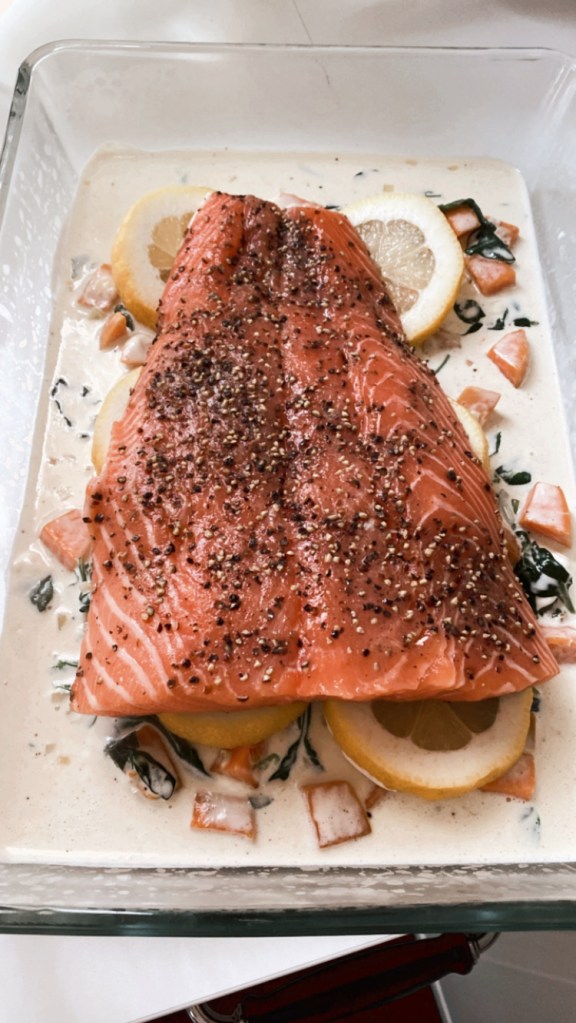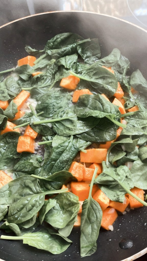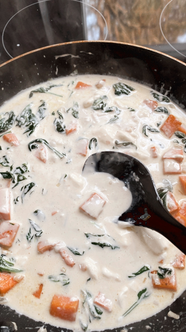 Den Ofenlachs serviere ich mit einer sehr leckeren Sauce aus Mascarpone und Sahne. An die Sauce gebe ich angeschwitzte Schalotten, Knoblauch und Blattspinat sowie gebratene Süßkartoffelwürfel.