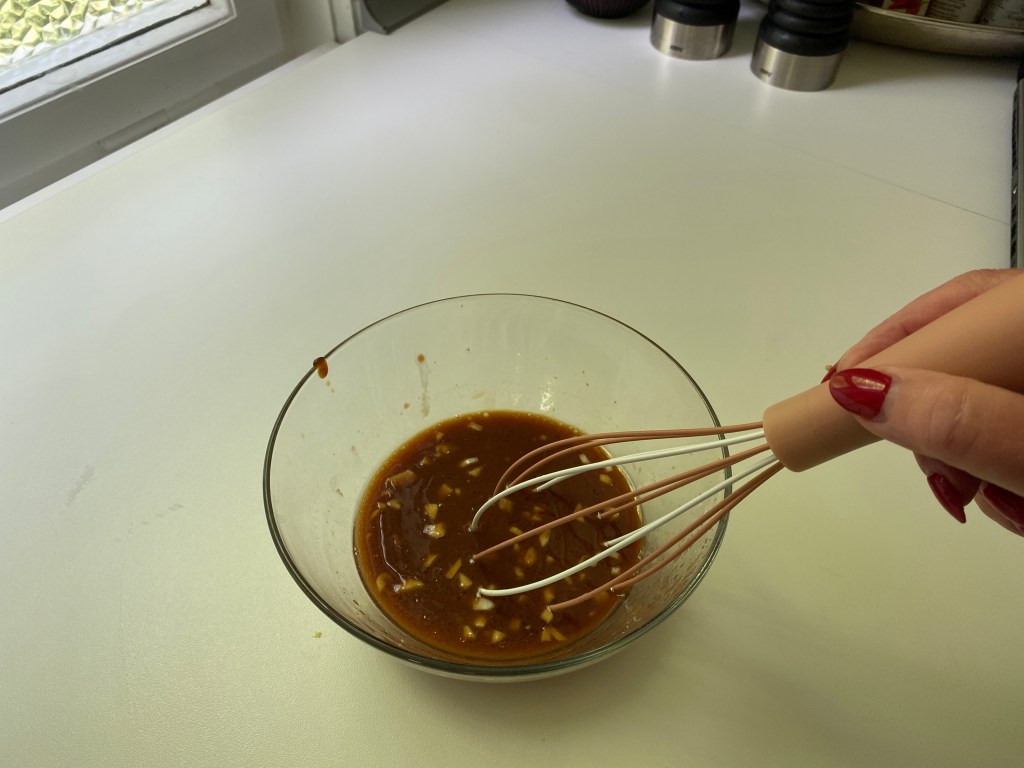 - Geröstetes Sesamöl – Achtet darauf, geröstetes Sesamöl und kein normales Sesamöl zu nehmen. Das geröstete Öl hat einen tieferen Geschmack! Die Samen werden geröstet, bevor sie zu einem Öl verarbeitet werden.