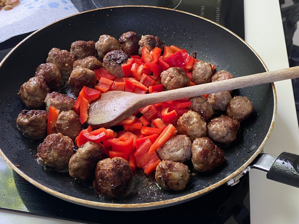 - Fügt gewürfelte rote Paprika zu Fleischbällchen hinzu. Gießt die Sauce darüber. Sauce köcheln lassen, bis sie leicht verdickt.