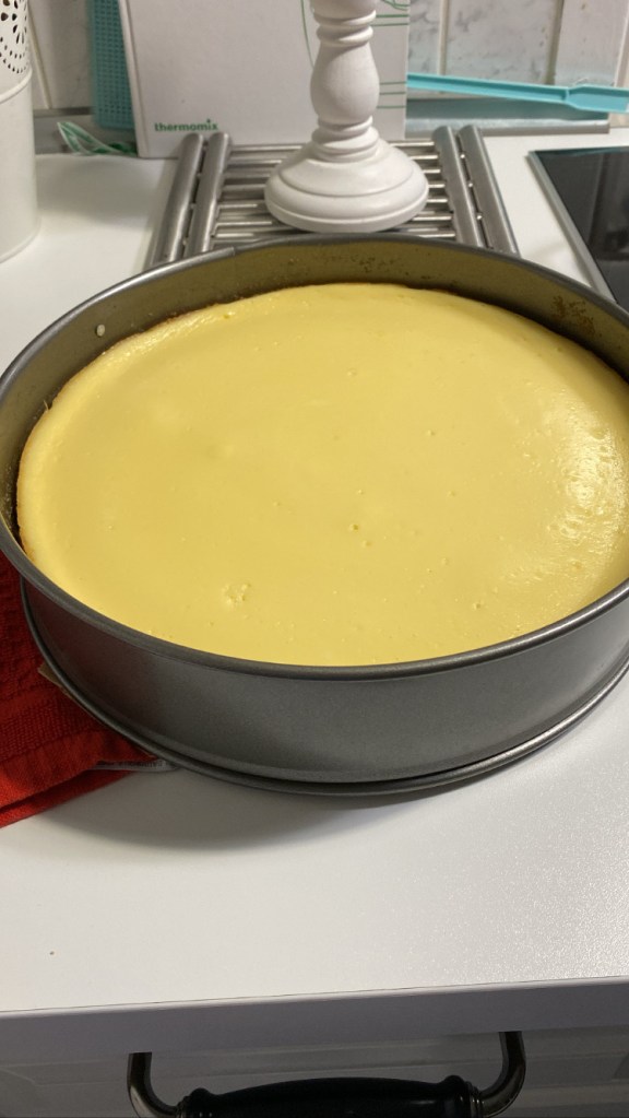 • Den Cheesecake im Ofen für 40 Minuten backen und dann den Ofen ausschalten und den Käsekuchen für 5-6 Stunden oder über Nacht bei geschlossener Ofentür auskühlen lassen. Beten!