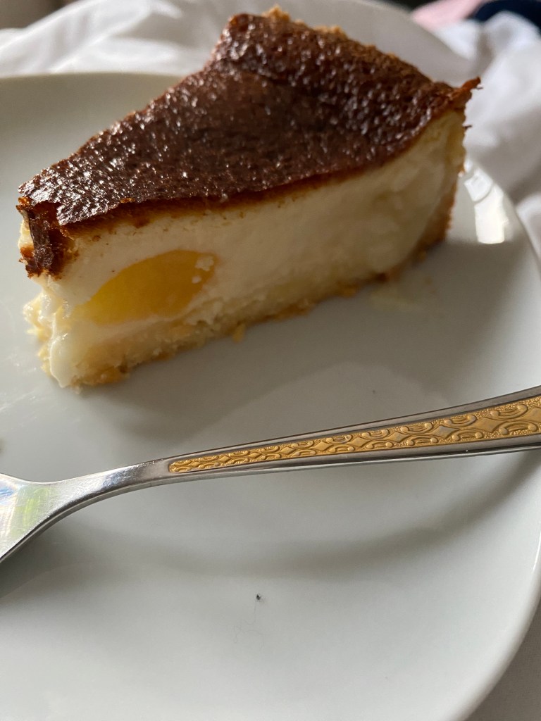 Birnen abtropfen , 250 ml Saft abmessen. 6 El davon mit der Stärke verrühren. Rest mit Sahne und 2 El Zucker aufkochen. Stärke zugeben und kurz aufkochen. Teig in eine Springform ( 28 cm) geben, einen Rand hochziehen. Birnen mit der Wölbung nach oben auflegen. Sahnemischung darüber. Eier trennen, Eigelb und saure Sahne verrühren. Eiweiß und 50 g Zucker steif schlagen, unterheben. Über dem Kuchen verteilen. Bei 200 Grad 60 Minuten backen.