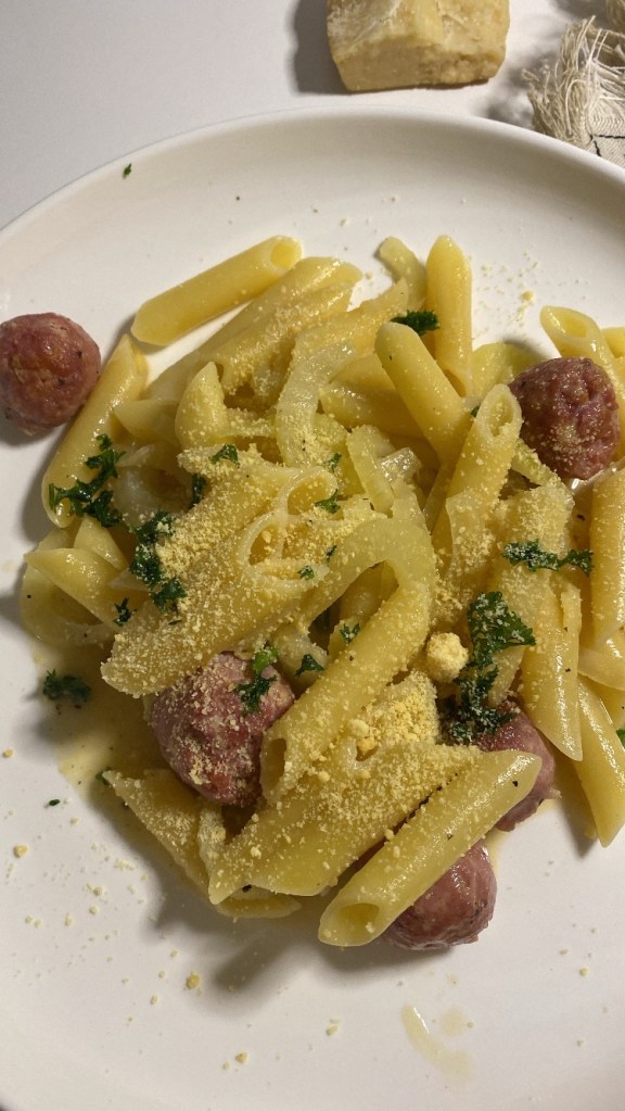 Würstchen zu Bällchen aus dem Darm drücken. In etwas Öl anbraten.Zitronenabrieb, Fenchel , Wein und Brühe zugeben. Einköcheln lassen. Pasta kochen, abgießen und mit der Soße mischen. Abschmecken. Mit Petersilie und Parmesan bestreuen.