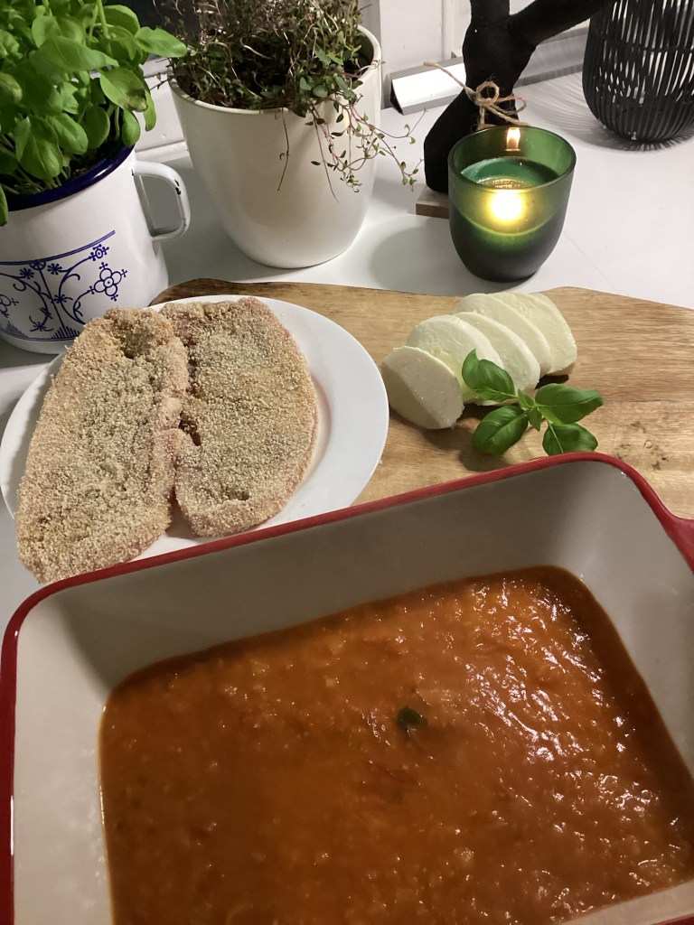 Die Schnitzel von beiden Seiten in der Pfanne kurz anbraten. Die Tomatensoße in eine Auflaufform geben und die knusprigen Kollegen darauf verteilen.