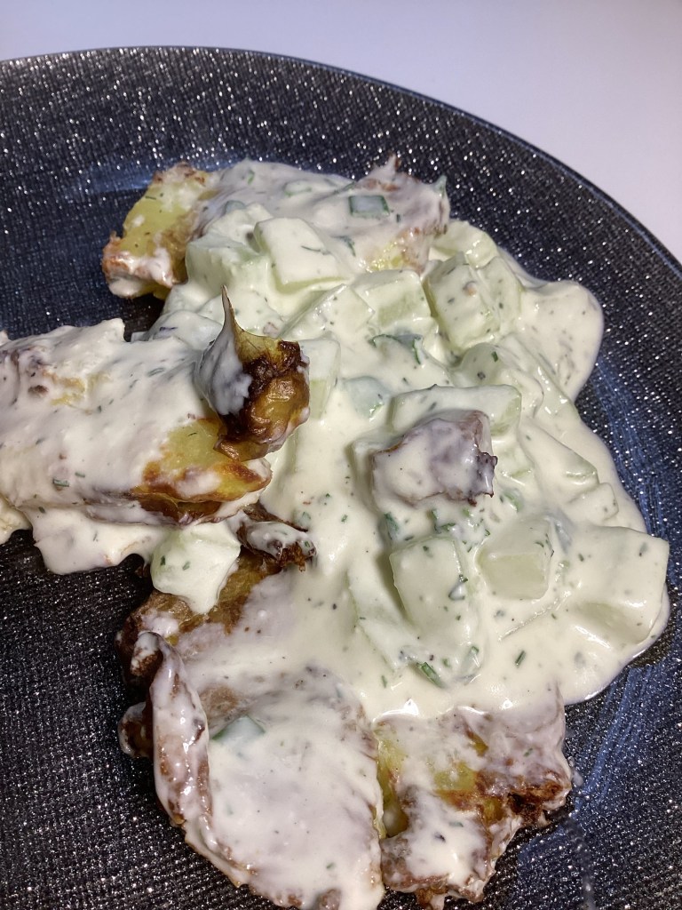 Gemischt werden hier Smashed Kartoffeln mit einem Gurkensalat mit Joghurt-Kräuter-Dressing.