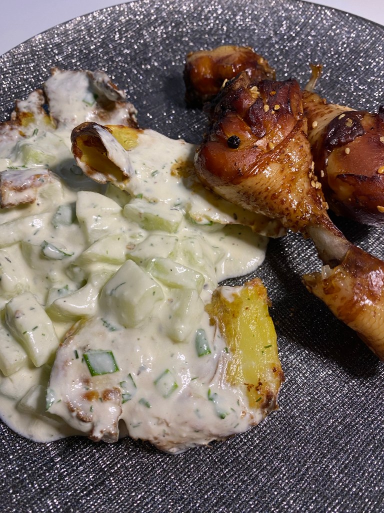 Die Kartoffeln sollte man bereits am Vortag oder eine gute Weile vorher kochen damit sie gut auskühlen können. Während die Kartoffeln im Ofen (oder Airfryer) knusprig gebacken werden, ist genügend Zeit, um den Gurkensalat mit dem cremigen Joghurtdressing zuzubereiten.