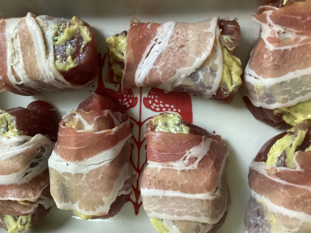 Filet in 2-3 cm dicke Medaillons schneiden. Mit Salz und Pfeffer würzen und mit Senf bestreichen. Je eine Scheibe Bacon um die Medaillons wickeln. Die ,,Nahtstelle“ nach unten in die Auflaufform legen.