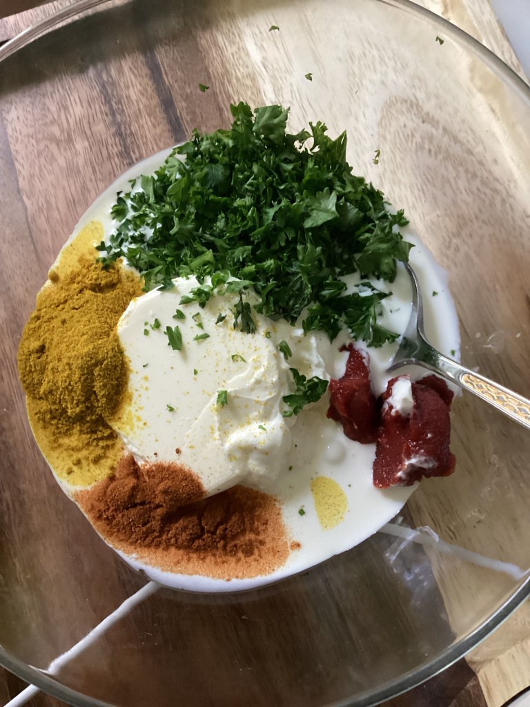 Petersilie hacken. Sahne, saure Sahne, Curry, Tomatenmark und Petersilie verrühren.