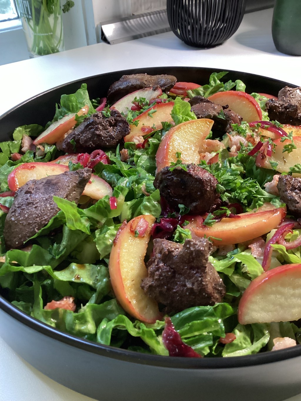 Salat waschen, in Streifen schneiden. Speck würfeln, Zwiebeln in dünne Scheiben schneiden, Petersilie hacken, Apfel mit Schale in Spalten schneiden. Apfel mit etwas Zitronensaft beträufeln. Leber waschen, mit Küchenpapier trocknen.