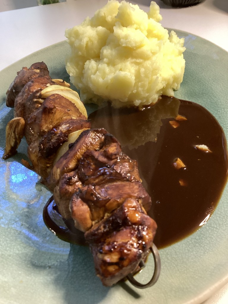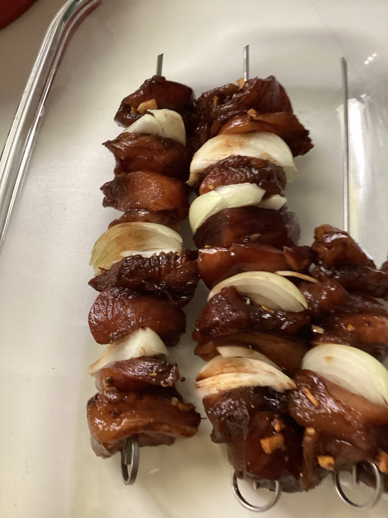 Marinade durch ein Sieb geben ( ich habe diesen Schritt weggelassen und später bereut, zu viel Ingwer in der Soße). Geflügelfond zugeben und aufkochen. Stärke mit etwas Wasser verrühren und untergeben. Hähnchen mit Zwiebel, welche in Spalten geschnitten wurde auf Spieße geben. Holzspiesse vorher in Wasser einweichen, dann bleibt das Fleisch nicht haften. Ich hatte Metallspieße.