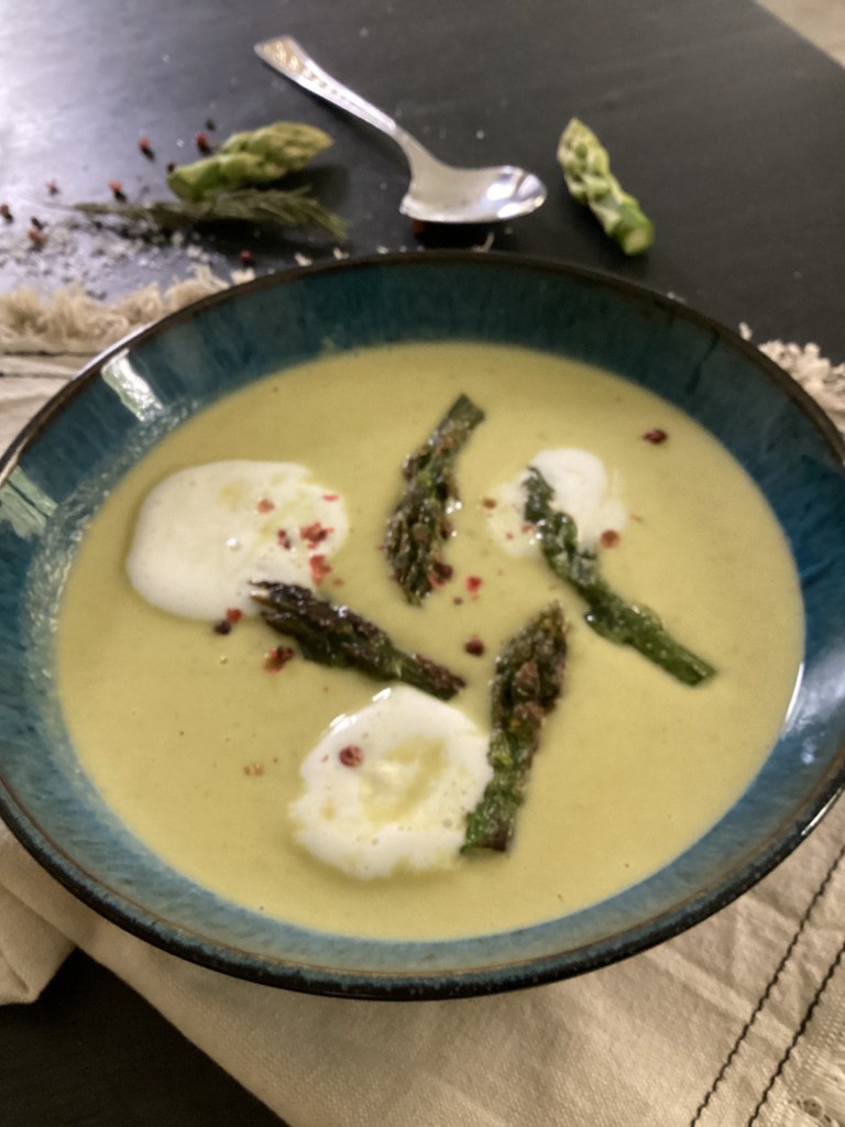 - Die Suppe mit ein wenig aufgeschlagener Sahne, den gebratenen Spargelspitzen und rosa Pfefferkörnern servieren. Probiert mal mein leckeres Focaccia dazu.