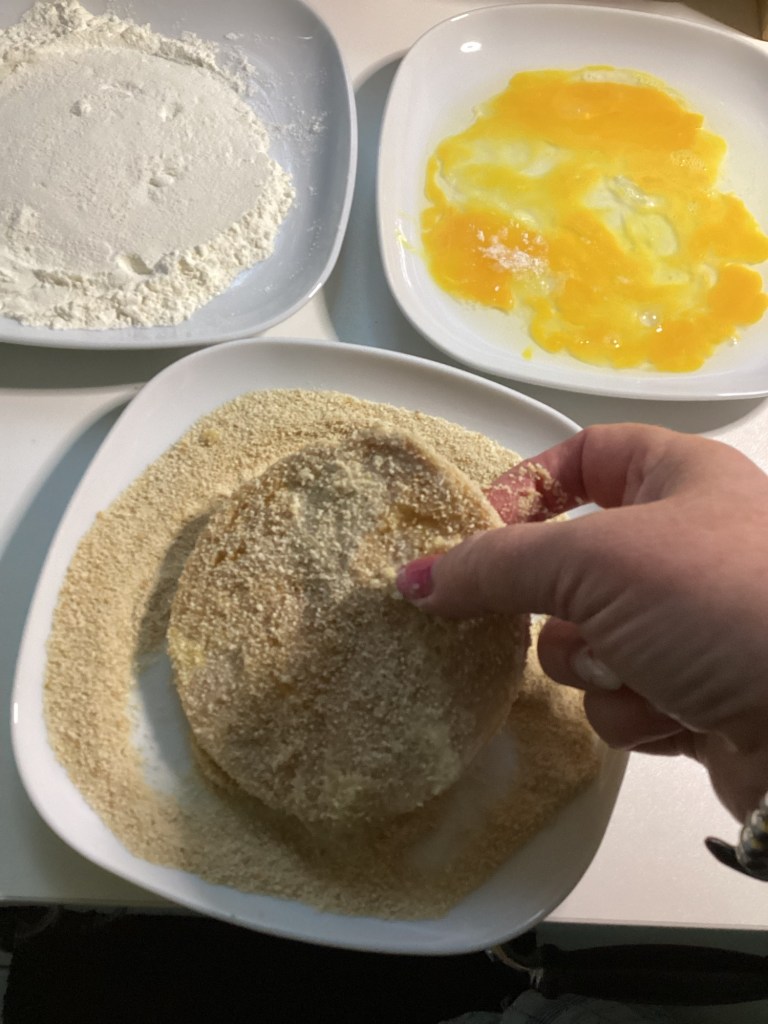 Die Wurst wird dann wie ein Schnitzel mit Ei und Semmelbröseln paniert und in Margarine ausgebraten.
