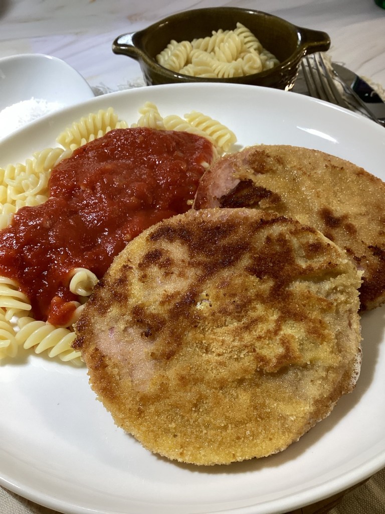 Heute stand Jägerschnitzel auf dem Speiseplan. Herr Fürst hatte auf ein Schweineschnitzel mit Pilzen gehofft, er schaute etwas verdutzt als das Essen auf den Tisch kam. Eine runde panierte Scheibe begleitet von Tomatensoße und Spinelli – DDR Jägerschnitzel eben. Quasi eine Scheibe Wurst, die sich für ein Schnitzel hält.