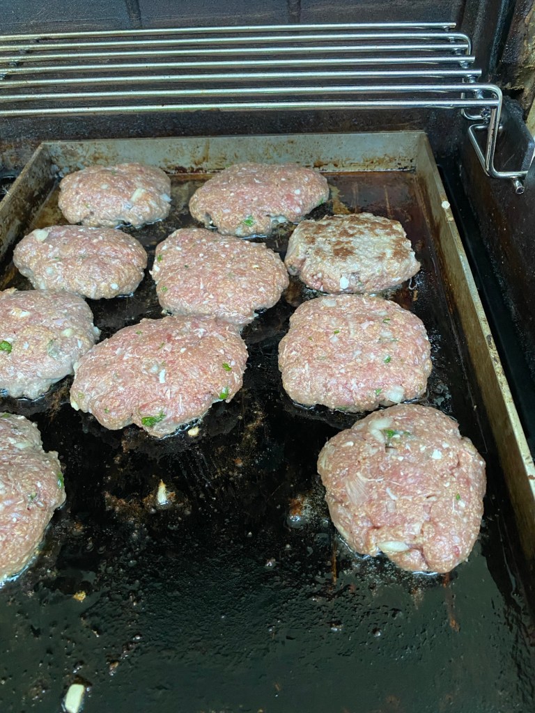 - Hände mit Wasser nass machen und leicht längliche und flach gedrückte Bifteki-Klopse zu formen.