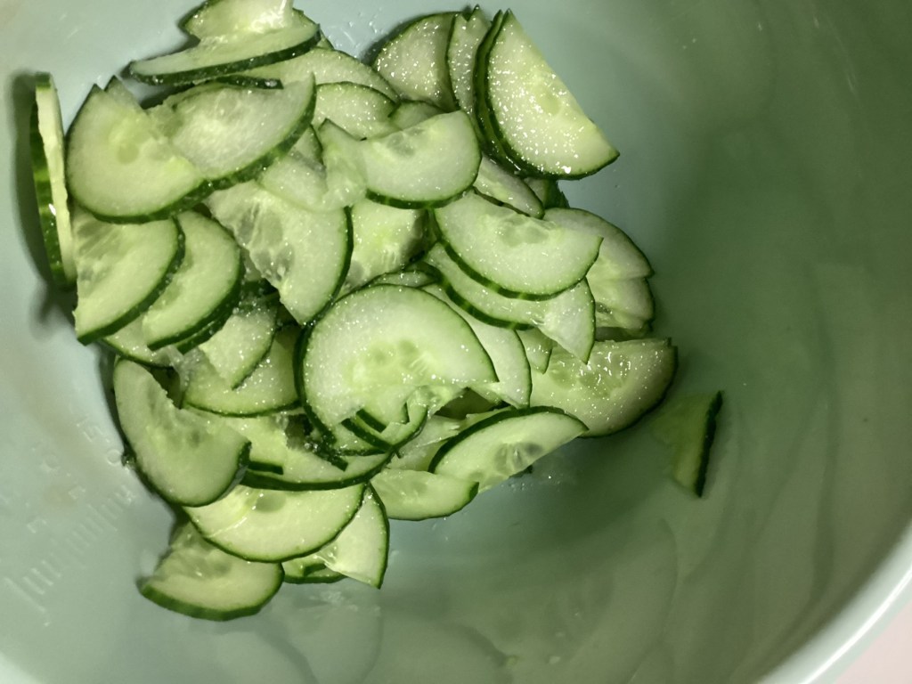 und Salz bestreuen, die Gurkenscheiben kurz beiseite stellen und Wasser ziehen lassen.