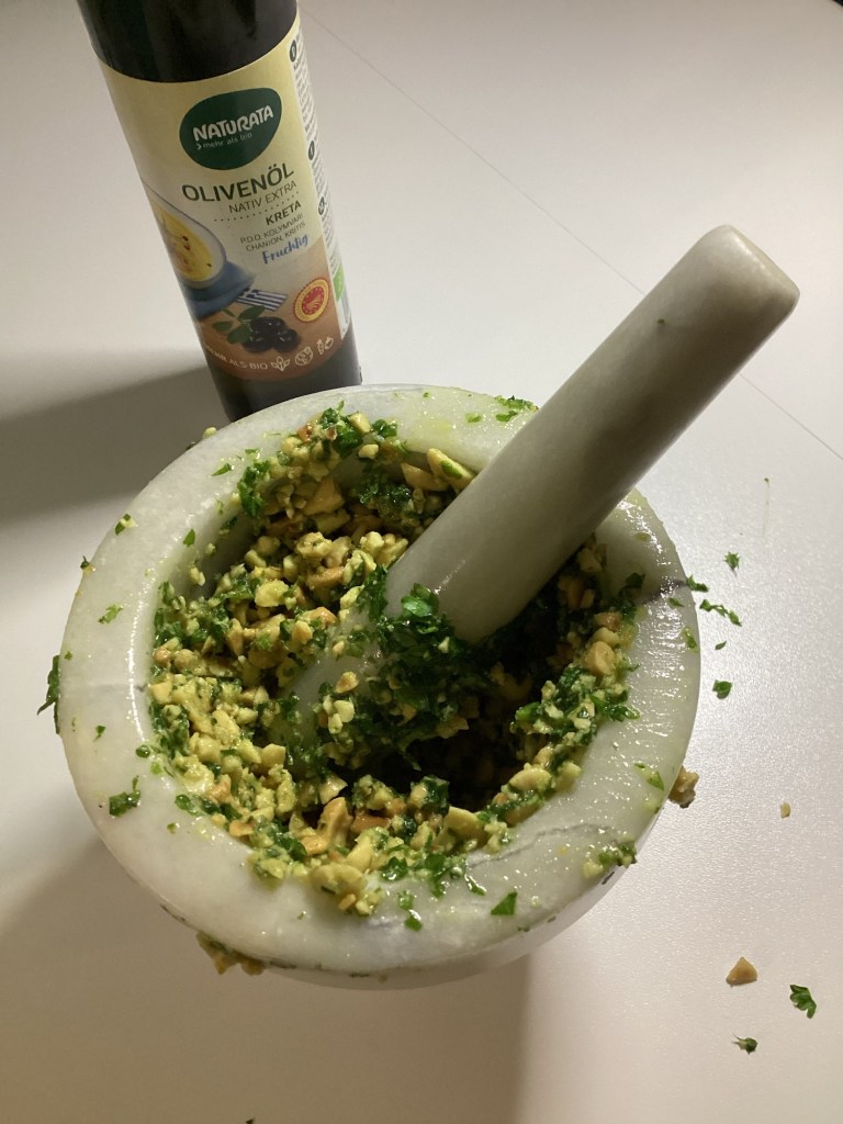 In der Zwischenzeit Petersilie hacken, zusammen mit den Erdnüssen in einen Mörser geben und zerstoßen. 3-4 EL gutes Olivenöl und 1 EL Weißweinessig unterrühren, bis die gewünschte Konsistenz des Pesto erreicht ist. Mit Salz abschmecken, falls noch nicht genug Salz durch die Nüsse vorhanden ist.