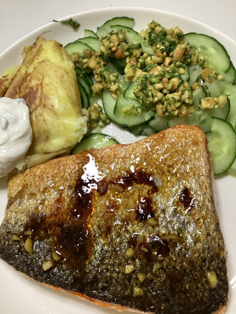 Solange braten, bis die Haut richtig schön kross ist, den Lachs wenden. Die Soja-Honig-Sauce über den Lachs gießen (die karamellisiert jetzt noch in der Pfanne) , kurz weiterbraten, bis der Lachs gar ist. Jetzt noch etwas von der karamellisierten Sauce, die mittlerweile sirupartig eingekocht ist, über die Haut geben und zusammen mit dem Gurkensalat und Pesto servieren.