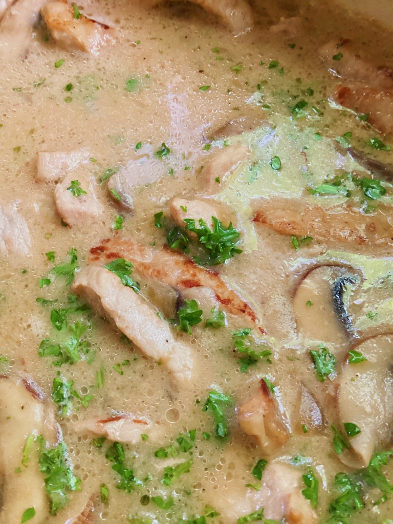 Kurz gesagt: Es ist Kalbfleisch, das in Streifen geschnitten und mit Zwiebeln, Weisswein, Rahm und Champignons zu einem cremigen Traum verkocht wir