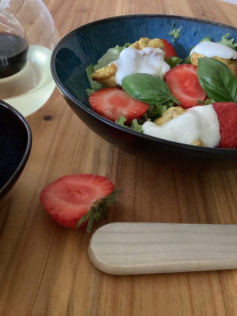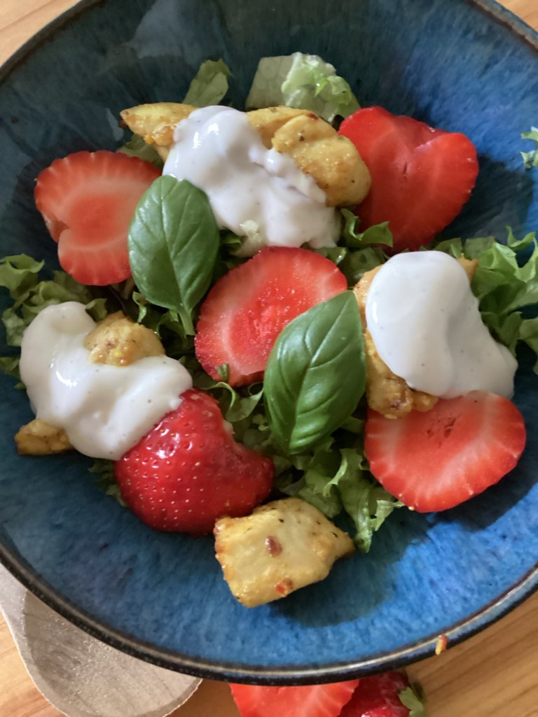 Fruchtige Erdbeeren und knuspriges Hähnchen passen perfekt zueinander.