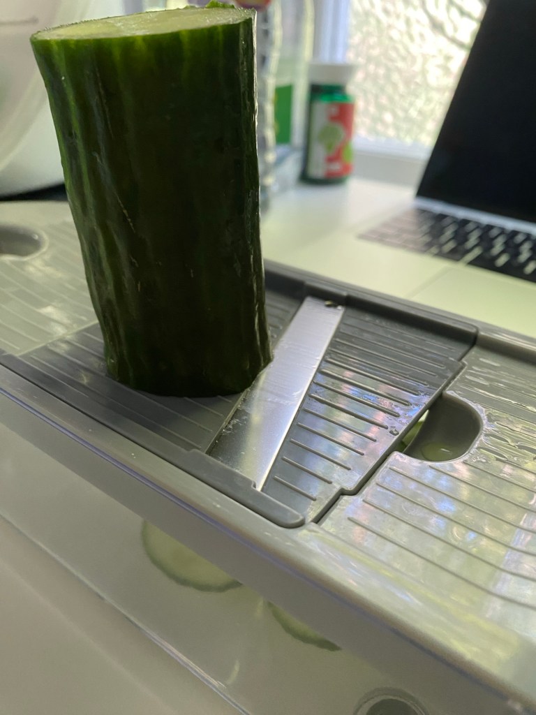 Die Salatgurke in dünne Scheiben hobeln und in ein Sieb geben. Die Gurkenscheiben salzen und für 30 Minuten abtropfen lassen. Nach 30 Minuten abgießen, vorsichtig ausdrücken oder kalt abspülen.