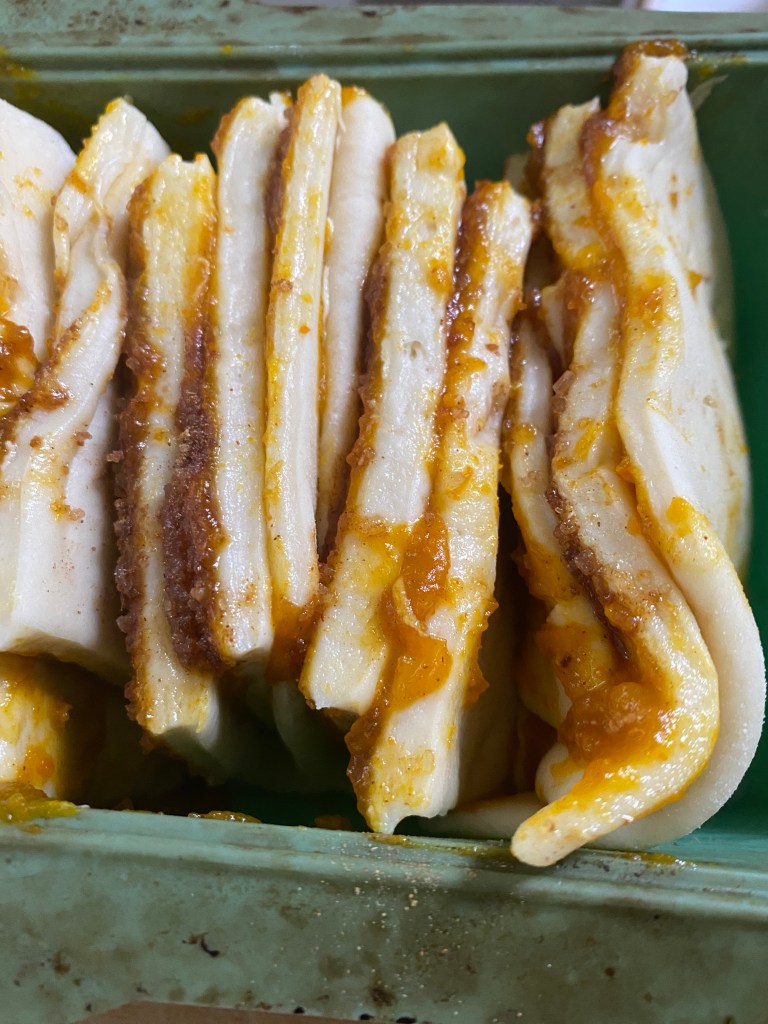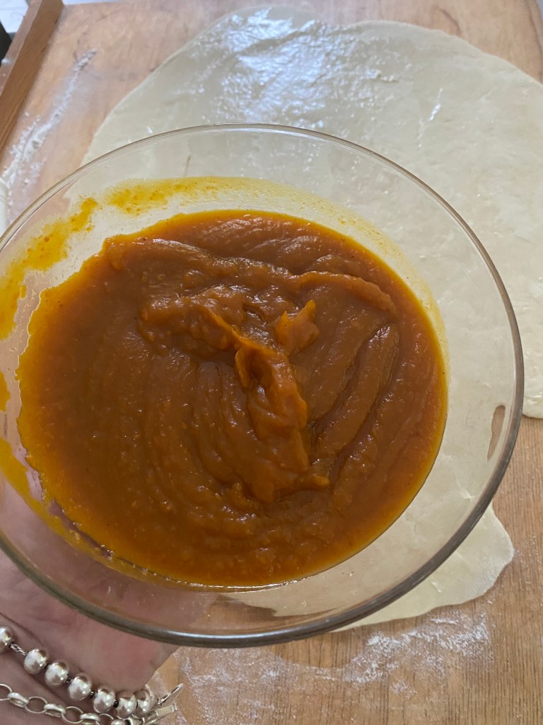 Streicht anschließend die Kürbisfüllung gleichmäßig darüber. Zum Schluss vermischt ihr Rohrzucker und Pumpkin Spice und streut das Ganze über die Kürbisfüllung.