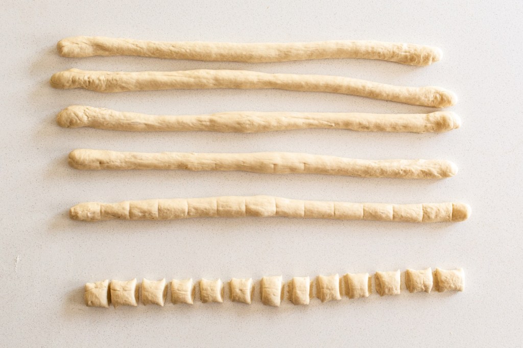 Schneidet mit einem Messer 1 1/2 cm Stücke von jedem Strang ab. Achtet darauf, diese nicht zu groß zu schneiden, sie werden im Ofen aufblähen! Auf die beiden Backbleche legen.