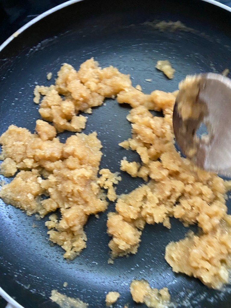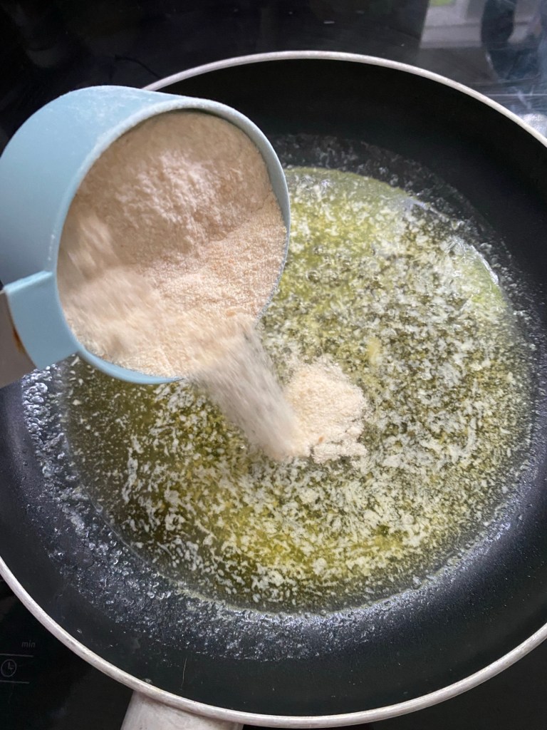 - In einer Pfanne bei mittlerer Hitze 4 El Butter schmelzen. Sobald die Butter leicht gebräunt ist, füge 1/2 Tasse Semmelbrösel hinzu und rühre sie ständig um, bis sie leicht geröstet und goldbraun sind, dann sofort vom Herd nehmen und beiseite stellen, um ein anbrennen zu verhindern.