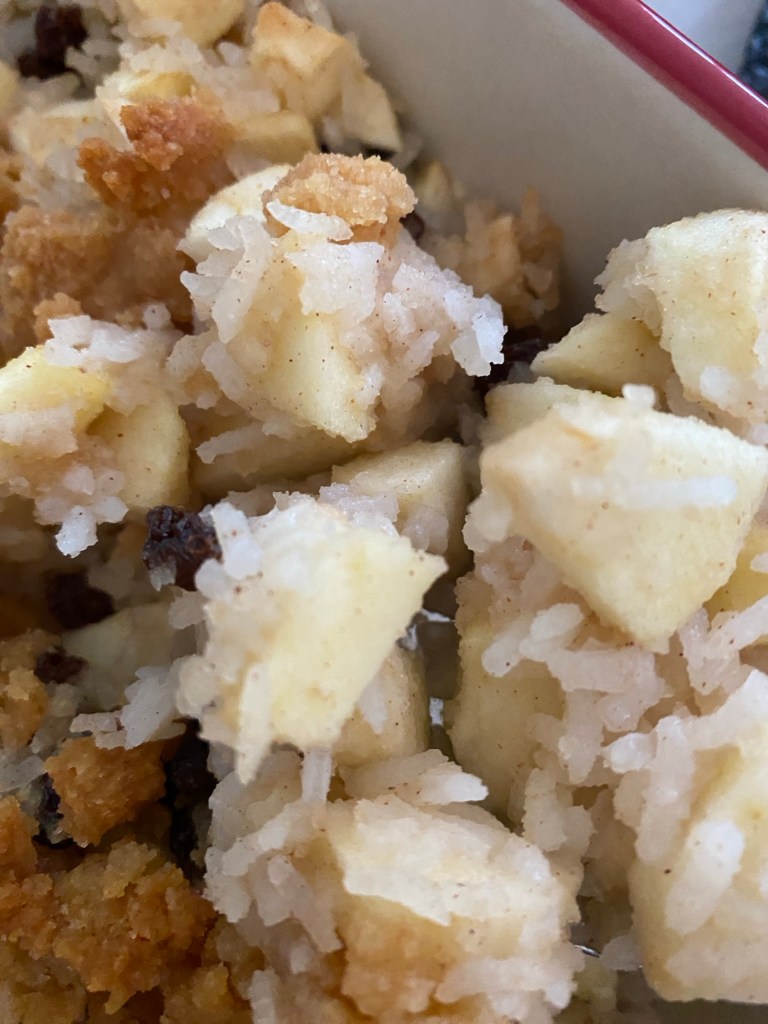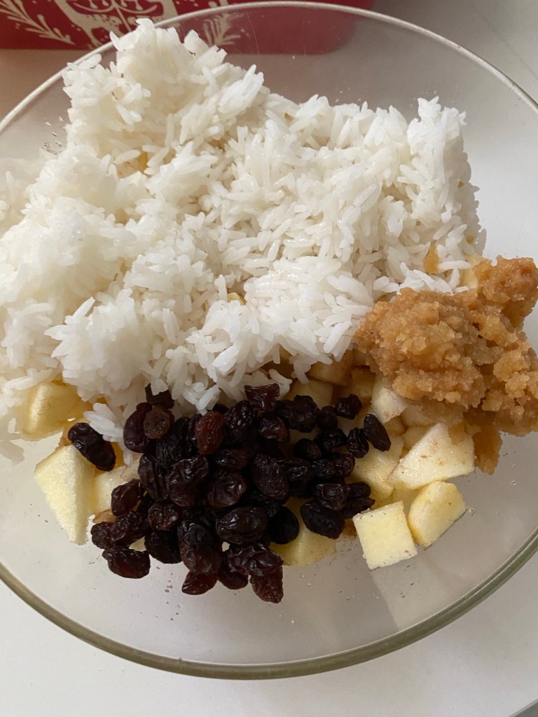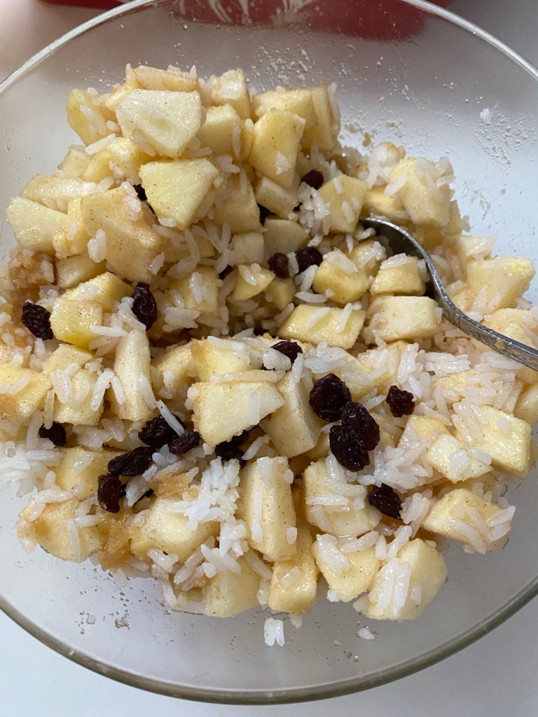 - In einer großen Rührschüssel gewürfelte Äpfel, 1/3 Tasse Zucker und 1/2 TL Zimt vermischen, dann 2 Tassen gekochten weißen Reis und 1/4 Tasse Rosinen unterrühren. 2 EL Semmelbrösel für den Belag aufbewahren und die restlichen Semmelbrösel in die Apfel-Reis-Mischung rühren. 3 Esslöffel Milch über die Mischung träufeln und umrühren, bis alles gut vermischt ist.