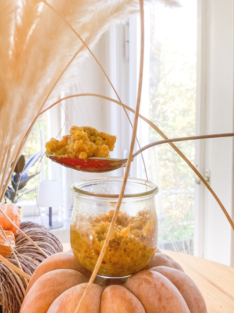 Ab jetzt gehört für mich Kürbispesto genauso zum Herbst wie bunte Blätter. Der Mix aus Hokkaido, Mandeln, Olivenöl und Parmesan ist super cremig und erhält Dank Knoblauch, Zitronensaft und Muskatnuss das gewisse Extra.