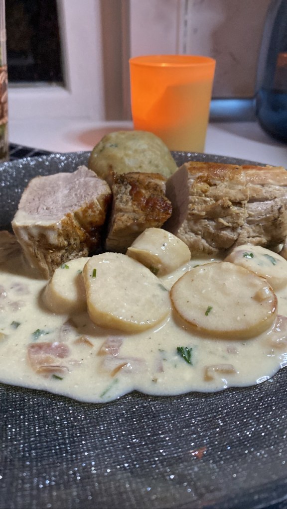 Schweinemedaillons in Kräuterseitlingsrahm mit Klößen