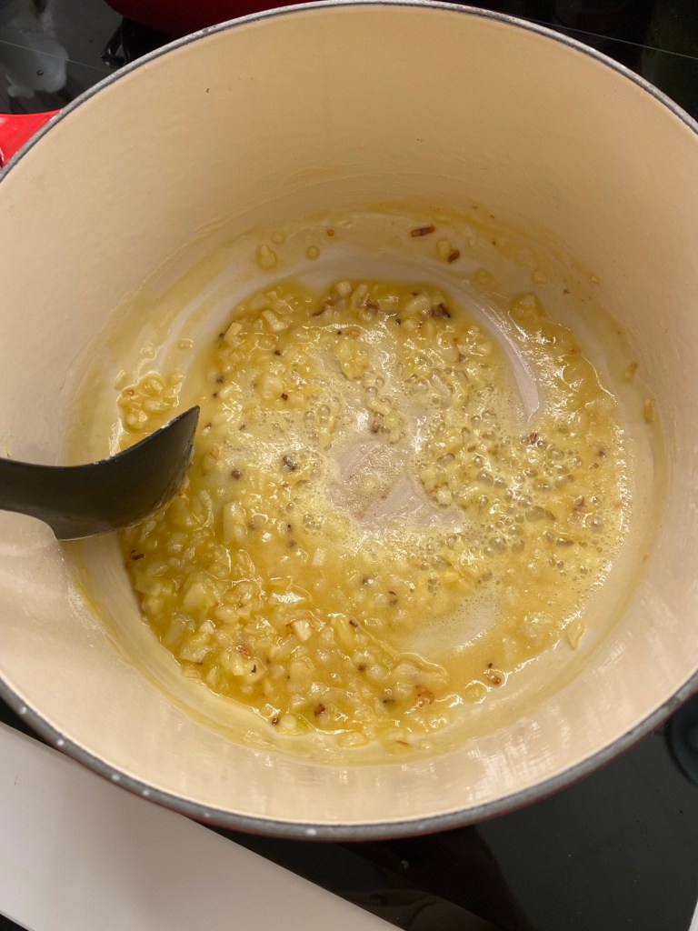 Butter in einen Topf geben und die Zwiebeln bei kleiner Hitze glasig anschwitzen. Den Knoblauch zufügen und 1 Minuten andünsten. 25 g Mehl hinzufügen und einrühren, bis das Mehl eine hellgelbe Farbe annimmt. Milch angießen und so lange rühren, bis die Sauce eine dickflüssige, glatte Konsistenz hat.