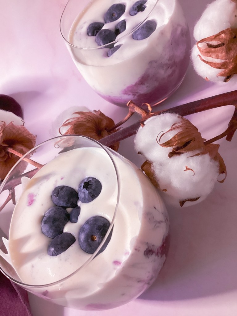 Bis zum Verzehr kühl stellen und mit Heidelbeeren dekorieren.