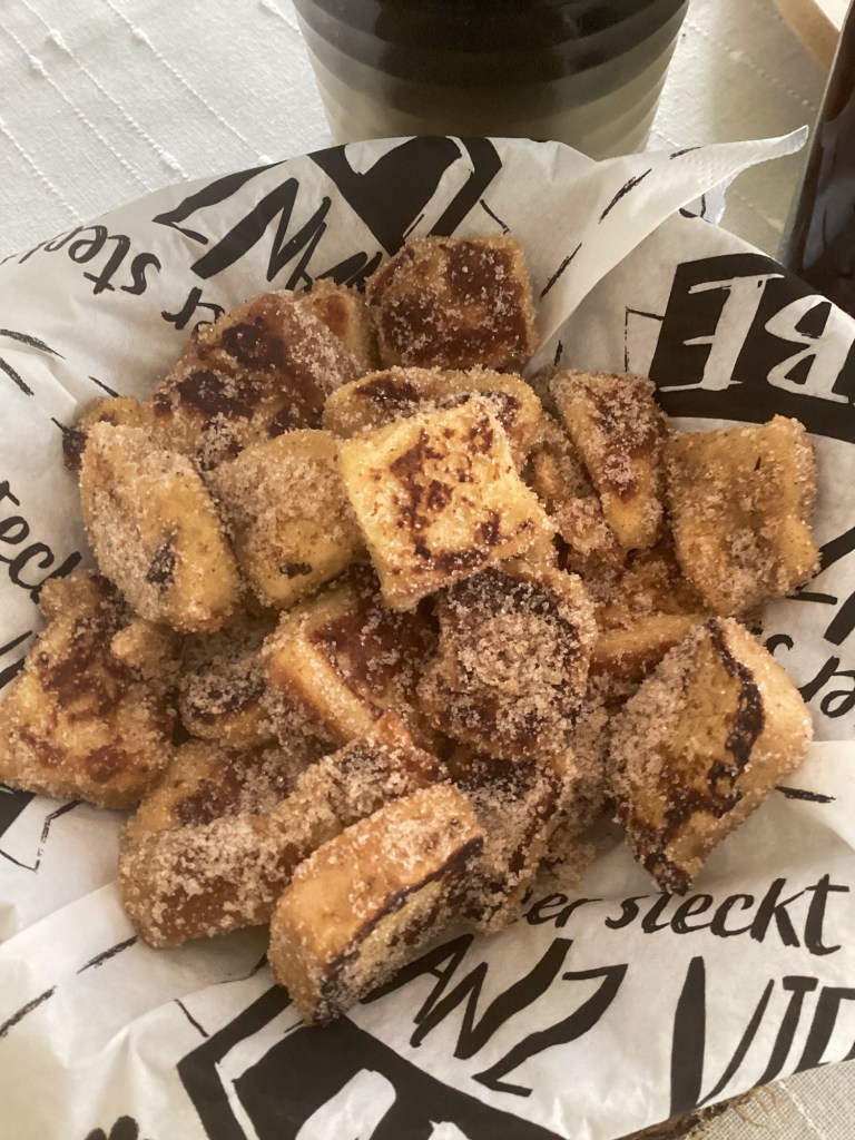Man kann mit Resten so tolle Sachen machen – diese French Tost Würfel mit Zimt & Zucker sind der beste Beweis dafür. Man muss sie aber nicht unbedingt aus altem Brot machen. Frisches Toastbrot funktioniert ebenfalls prima! Ich kann gar nicht genug von diesen Zimt-Zucker-Würfelchen bekommen. Außen knusprig, innen weich. Warm und süß mit einem Hauch von Zimt. Wer es auf die Spitze treiben möchte und wer mich kennt weiß, ich möchte!!!!!! Der tunkt sie noch in Ahornsirup und hat definitiv den besten Morgen seit langem. Essen kann so schön sein!
