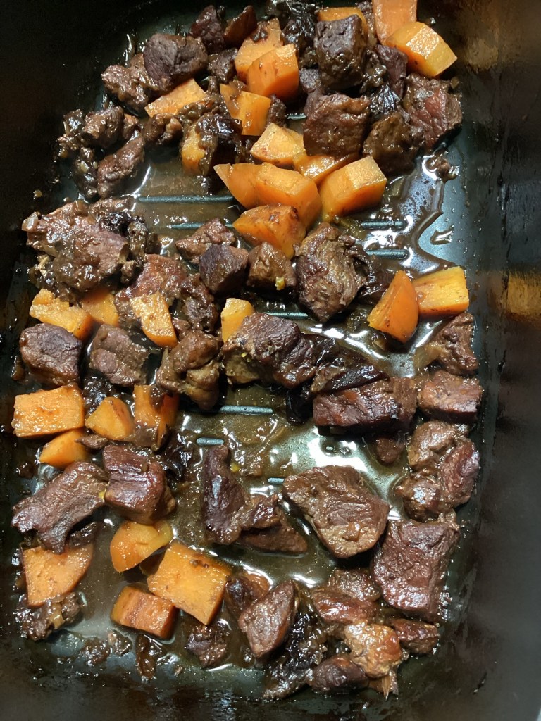 Nach ca. 2,5 Stunden die Süßkartoffeln in den Bräter geben und so viel Fond angießen das sie gerade so bedeckt sind. Weitere 20-25 Minuten schmoren, bis die Süßkartoffeln weich sind und dann das Gulasch mit Salz und Pfeffer abschmecken.