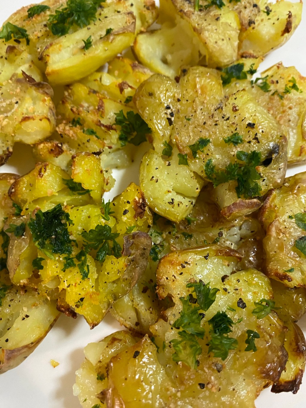 Zerdrückte Kartoffeln sind kleine Kartoffeln (Babykartoffeln), die weich gekocht und dann flach zerdrückt, mit Olivenöl beträufelt und an den Rändern knusprig gebacken werden. Ich gebe Parmesan darüber, weil wir einer käsigen Kruste nicht widerstehen können.