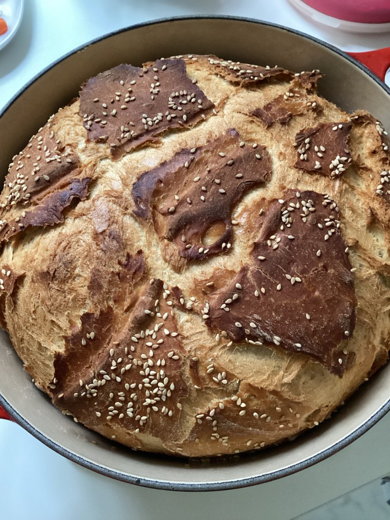 Teig 10 x falten, rund formen und in den vorbereiteten Topf legen, mit Sesam bestreuen, einschneiden, den Deckel auflegen und in den kalten Backofen schieben.