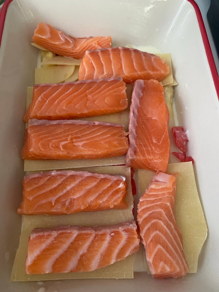 Auflaufform fetten. Zuerst Boden mit Lasagneblättern belegen, dann etwas Spargel und Tomaten belegen. Etwas Soße darüber gießen. Darauf eine Lage Lasagneblätter, darauf den Lachs. Wieder Soße angießen. Mit einer Schicht Spargel und Tomaten enden. Restliche Soße angießen. Mit Käse bestreuen und 40 Minuten backen.