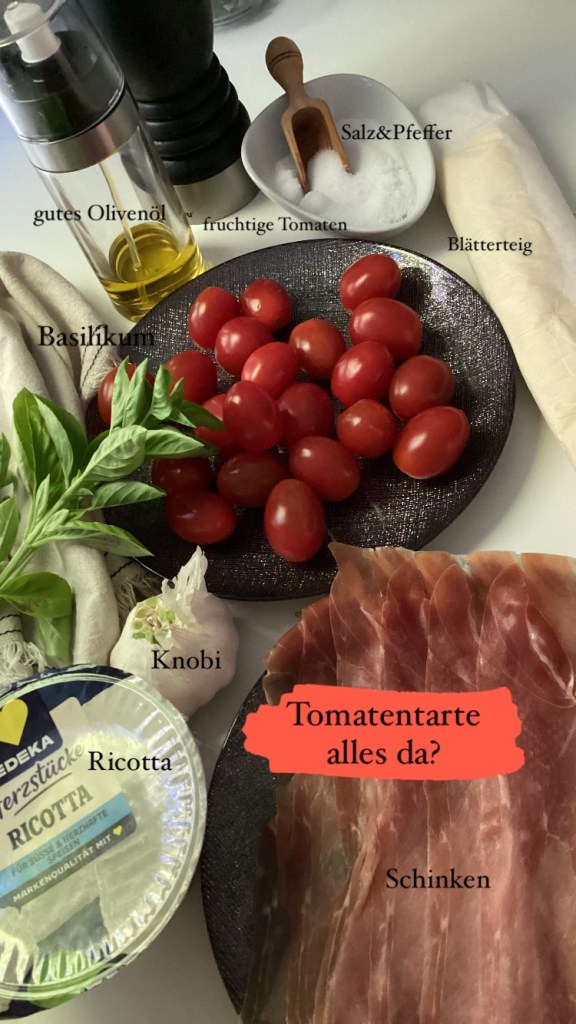 1 Rolle Blätterteig (aus dem Kühlregal – wir sind hier realistisch) 250 g Ricotta 100 g Frischkäse (für die Extracreme) Salz, Pfeffer, Zitronensaft (weil Fancy-Geschmack) 200 g Kirschtomaten (halbiert – hier liebe ich halbe Sachen!) 100 g luftgetrockneter Schinken (z. B. Parma, Serrano, oder der, der im Angebot ist) Frische Basilikumblätter 🌿