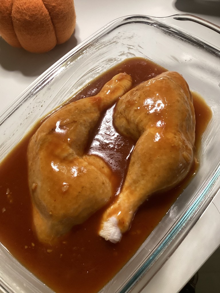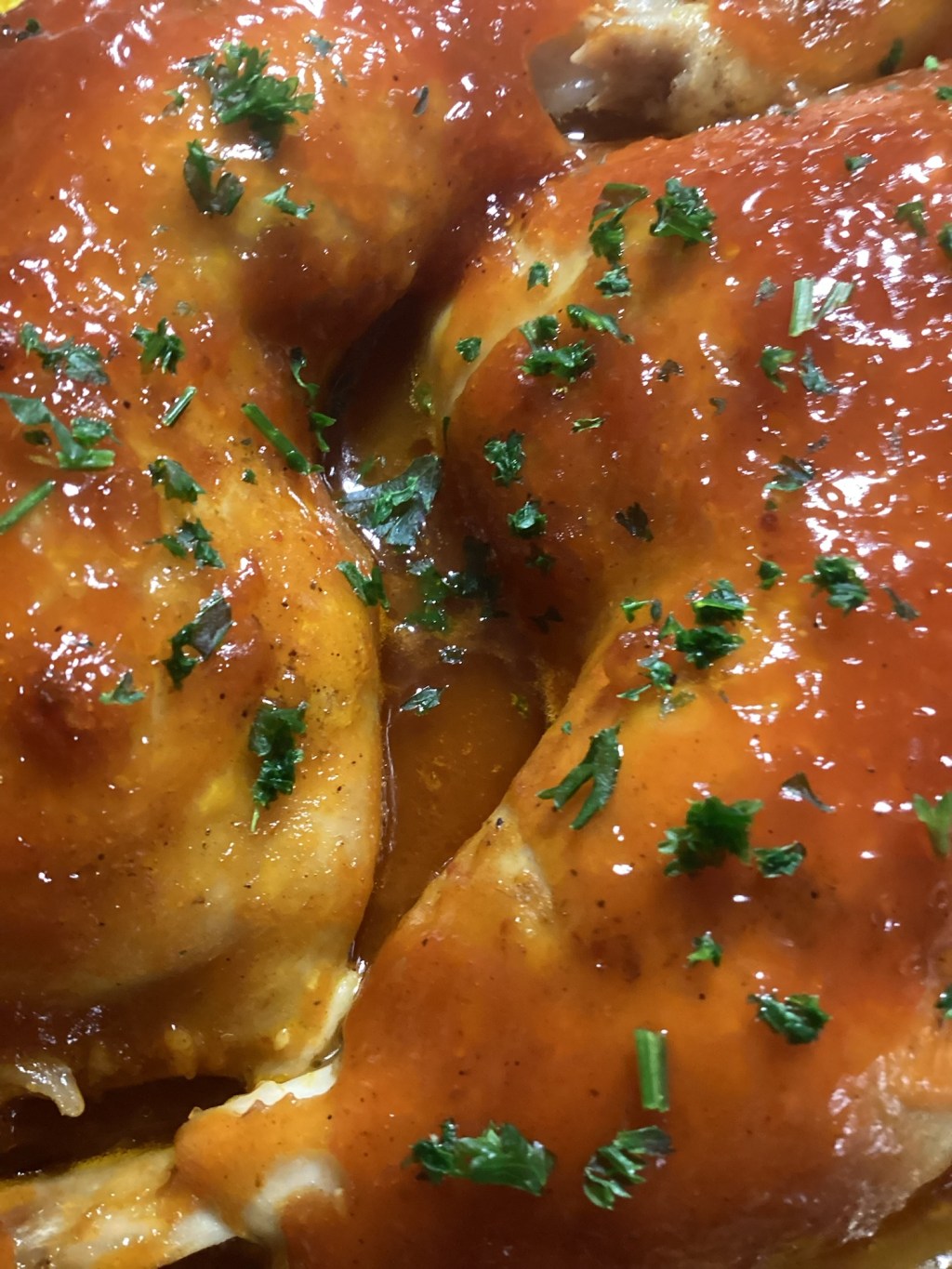 Hähnchen vorbereiten: Das Fleisch waschen, trocken tupfen und mit Salz, Pfeffer würzen. Knoblauch würfeln, ein Rapsöl kurz anschwitzen. Alle Zutaten außer dem Hähnchen zugeben. 10 Minuten köcheln. Backofen auf 220 Grad Ober-/Unterhitze vorheizen. Eine Auflaufform fetten. Hähnchen in die Form geben. Die Sauce über das Hähnchen gießen. 30-40 Minuten braten. Zwischendurch das Fleisch mit der Sauce übergießen, damit es schön glasiert wird. Servieren: Mit frischer Petersilie bestreuen und heiß servieren.