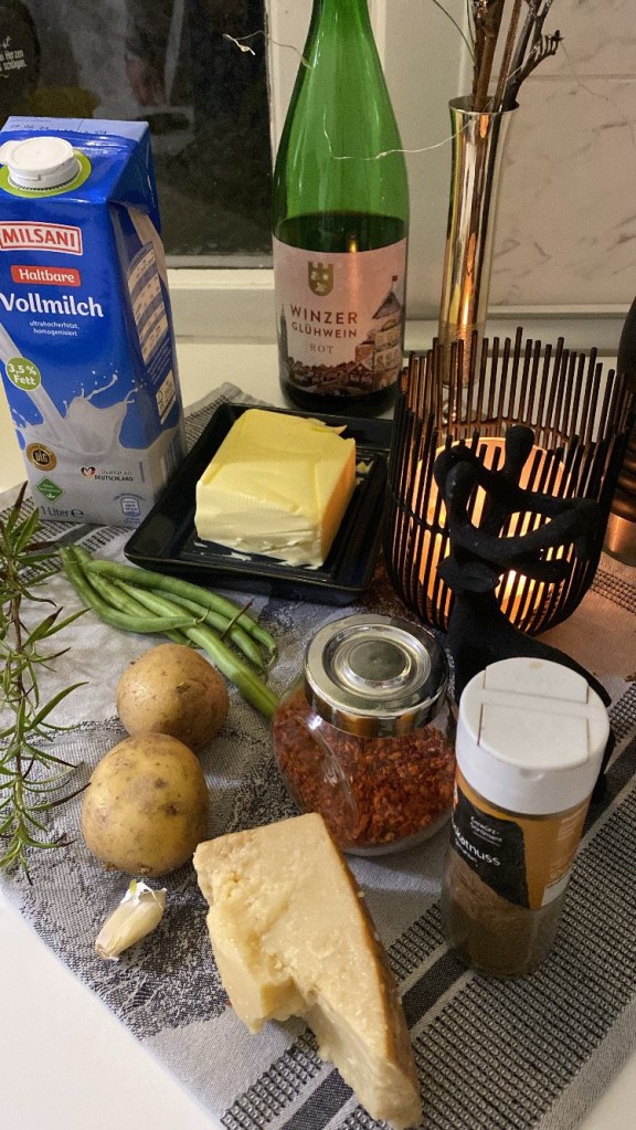 Kartoffeln 🥔 schälen und in Stücke schneiden. In Salzwasser gar kochen. Ca. 20 Minuten. Backofen auf 180 Grad Umluft vorheizen. Bohnen waschen, Enden abschneiden. Kräuter abzupfen. Parmesan reiben. Bohnen auf ein mit Parmesan belegtes Blech legen. Mit Olivenöl und Rosmarin mischen. Mit Salz und Pfeffer würzen, 15 Minuten backen.