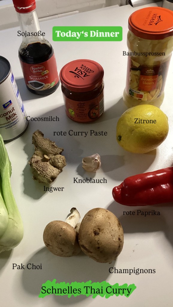2 Hähnchenbrustfilets 1 Dose (400 ml) Kokosmilch 2–3 TL rote Currypaste (je nach Schärfe) 1 rote Paprika 1 Pak Choi 150 g Champignons 1 Glas Bambussprossen (abgetropft) 1 Stück Ingwer (ca. 2 cm) 1 Knoblauchzehe 1 EL Sojasauce Saft einer halben Zitrone Öl zum Anbraten Salz nach Geschmack 150–200 g Jasminreis